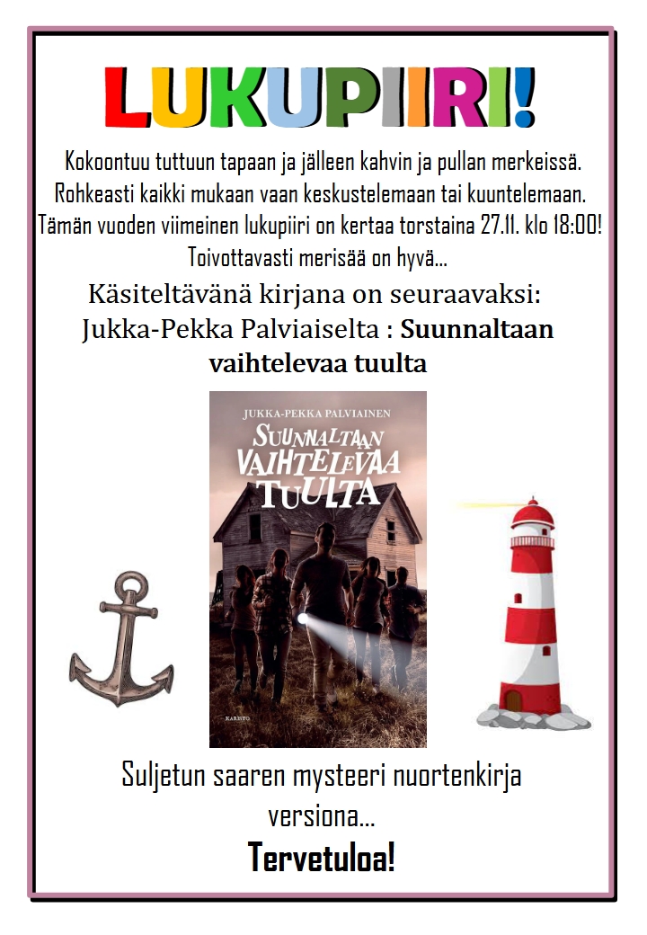 Lukupiiri kokoontuu tuttuun tapaan ja tietenkin kahvin ja pullan merkeissä. Rohkeasti kaikki mukaan keskustelemaan ja kuuntelemaan. Tämän vuoden viimeinen lukupiiri on torstaina 27.11. klo 18.00. Toivottavasti merisää on hyvä...Käsiteltävänä kirjana: Jukka-Pekka Palviaisen teos: Suunnaltaan vaihtelevaa tuulta.