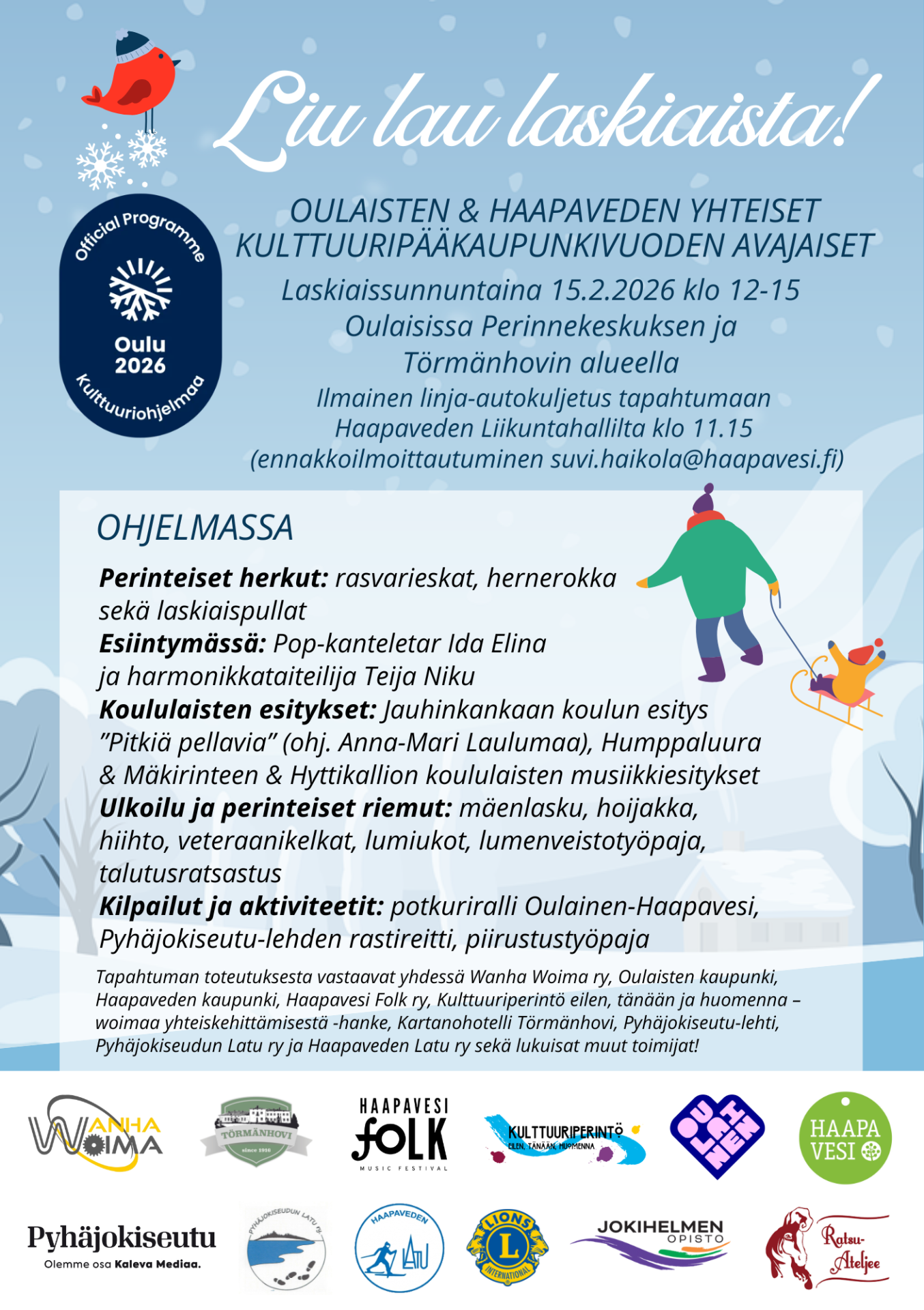 Liu lau laskiasta! Tervetuloa Oulaisten ja Haapaveden yhteisiin Euroopan kulttuuripääkaupunkivuoden avajaisiin sunnuntaina 15.2.2026 klo 12-15 Oulaisiin Perinnekeskuksen ja Törmänhovin alueelle!