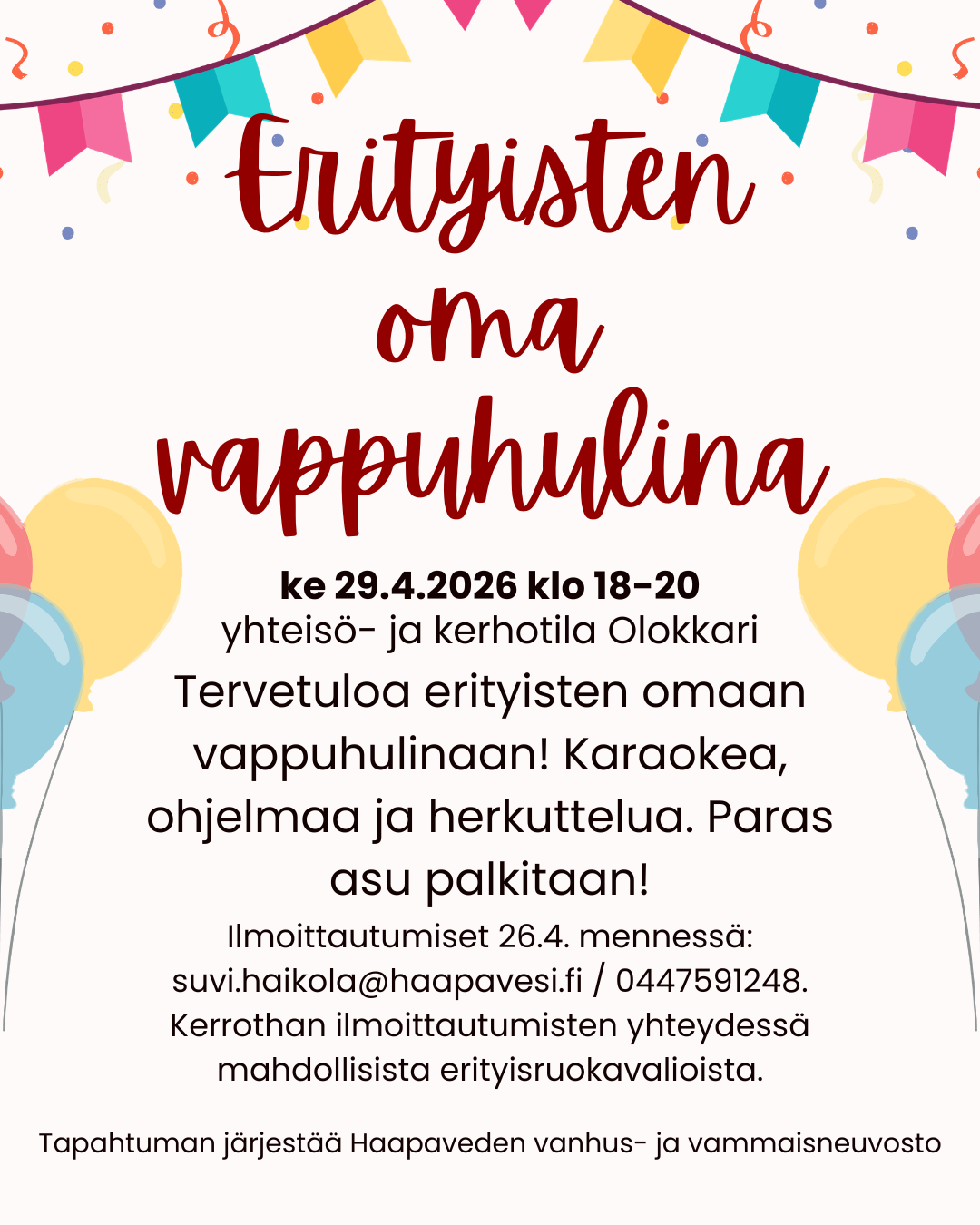 Tervetuloa eristyisten omaan vappuhulinaan yhteisö- ja kerhotila Olokkarille keskiviikkona 29.4.2026 klo 18-20!