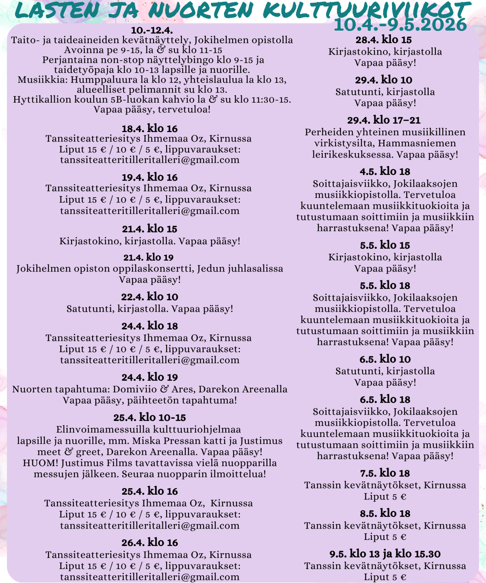 Lasten ja nuorten kulttuuriviikkoja vietetään 10.4.-9.5.2026! 🤩 Nappaa tästä ohjelma talteen ja suuntaa nauttimaan monipuolisesta kulttuuriohjelmasta 👇