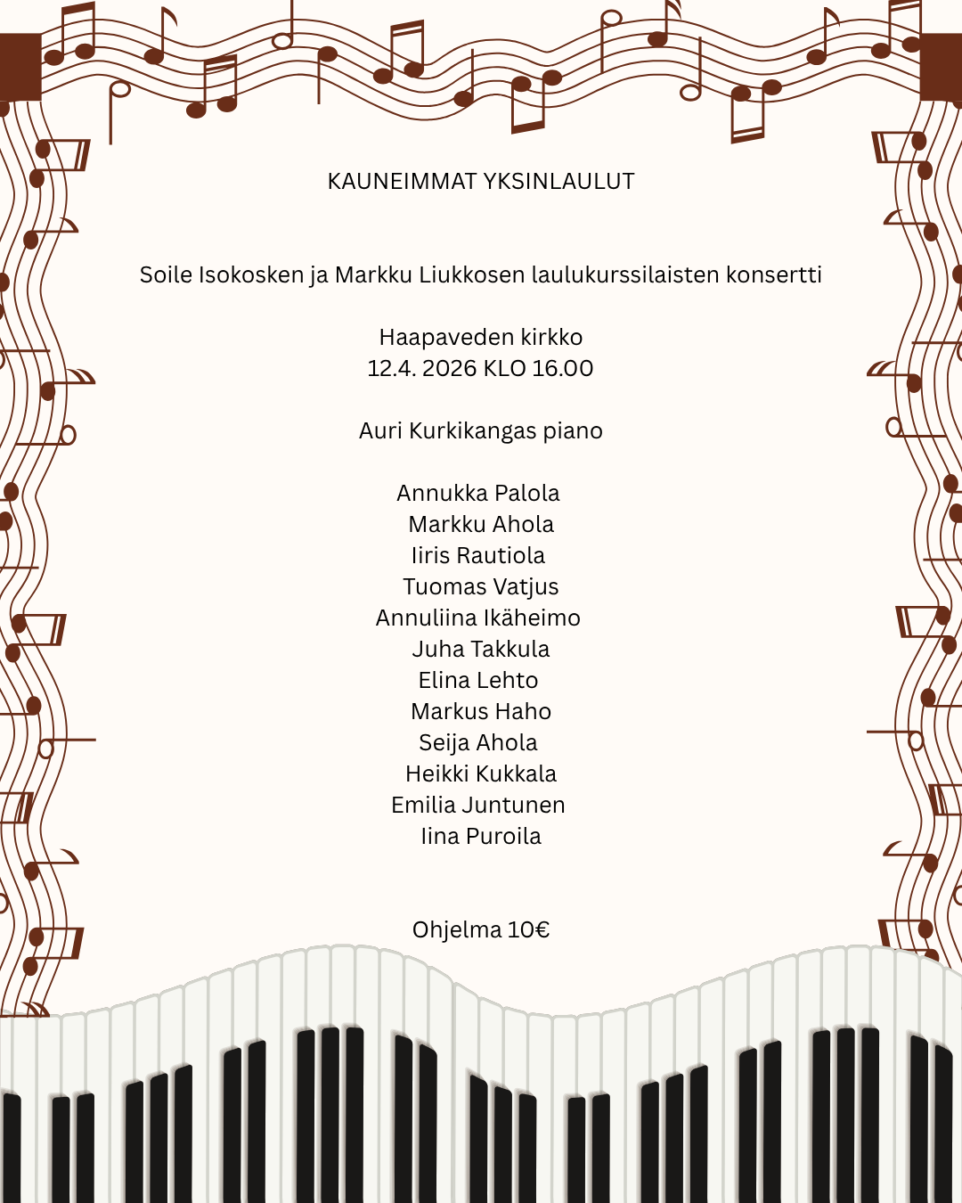 Soile Isokosken ja Markku Liukkosen laulukurssilaisten konsertti Haapaveden kirkossa 12.4. 2026 klo 16.00.