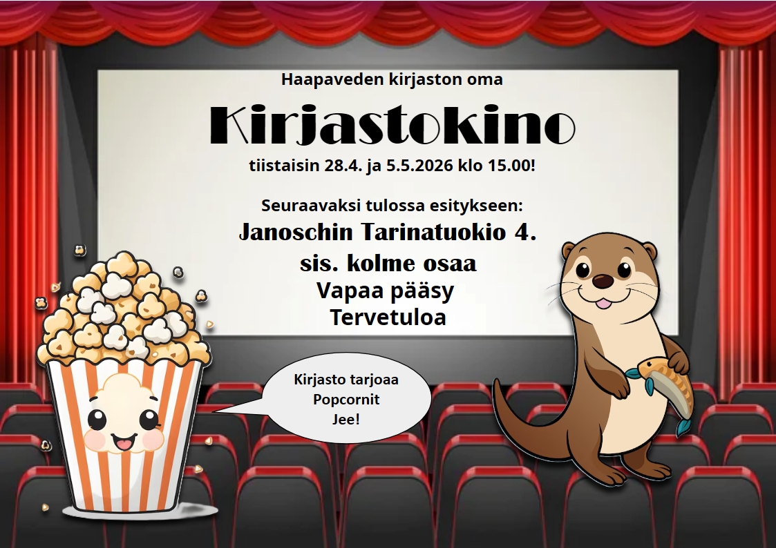Lasten ja nuorten kulttuuriviikkojen ohjelmaa Haapaveden kirjastolla. Kirjastokino kirjastossa tiistaisin 28.4. ja 5.5.2026 klo 15.00! Seuraavaksi tulossa esitykseen: Janoschin Tarinatuokio 4. (sisältää kolme osaa)! Kirjasto tarjoaa popcornit. Tervetuloa, vapaa pääsy! 📽️