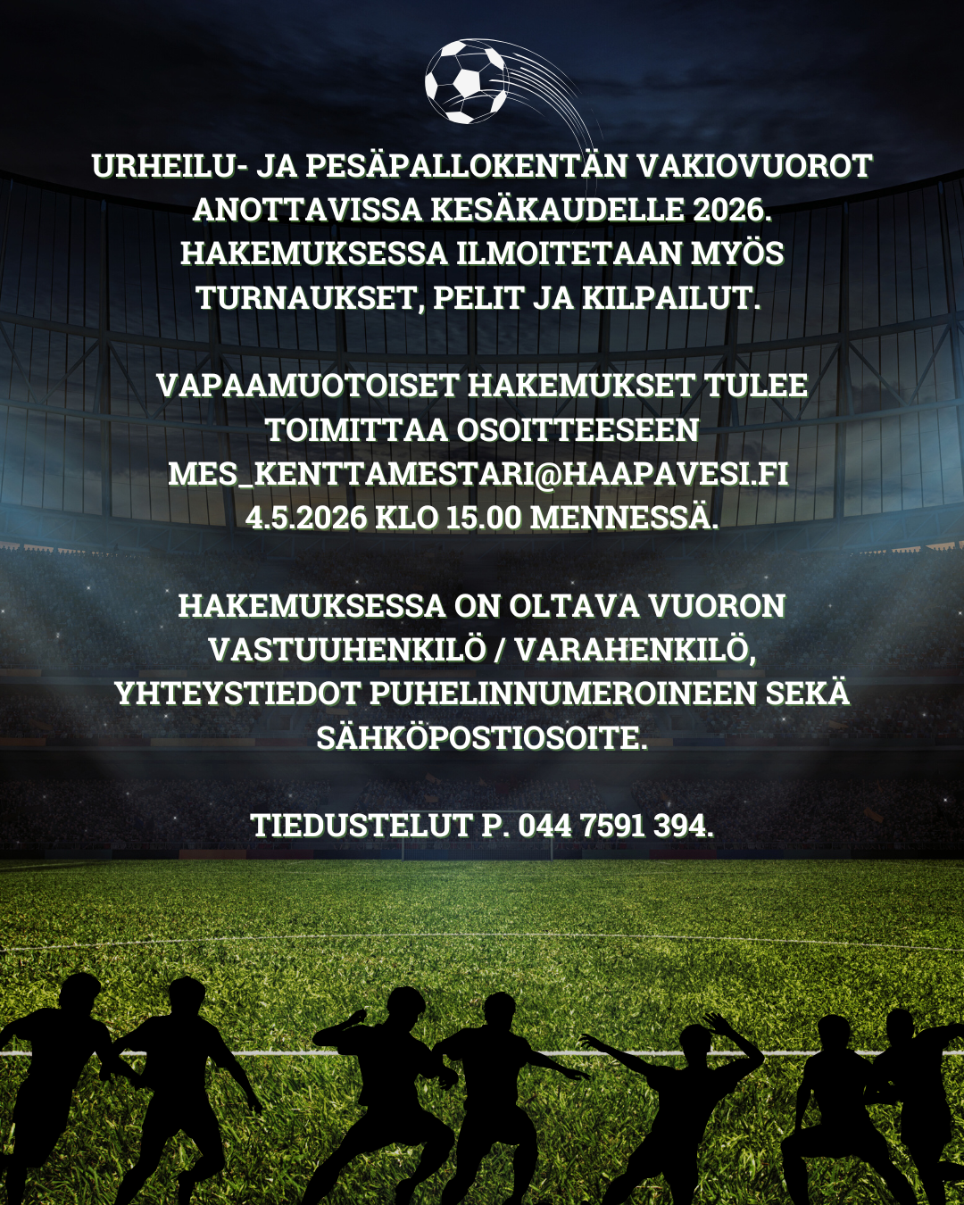 Ulkoliikunta-alueiden vuoden 2026 vapaamuotoiset hakemukset voi toimittaa osoitteeseen mes_kenttamestari@haapavesi.fi 4.5.2026 klo 15.00 mennessä.